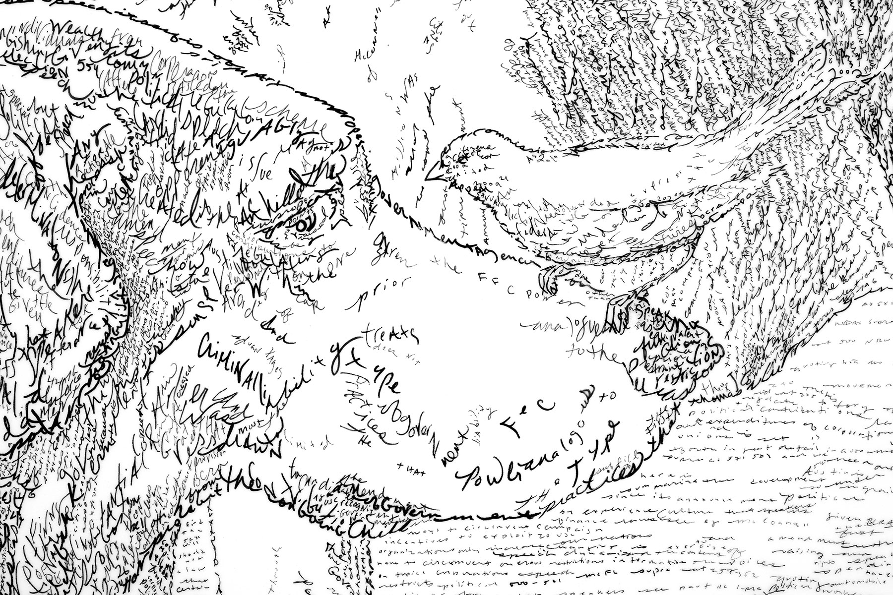 For the largest work in the show, entitled Redacted, Waugh copied over 350 pages of The Mueller Report. The report laid out definitive evidence of corruption and criminal activity within the 2016 Trump election campaign. Through Waugh’s hands, those words coalesce into an image of a nest of baby birds, with mouths expectantly open; But a swarm of wasps hovers overhead. As startling as this image may be, the real emotional weight of Waugh’s work is held in the intricacy of his handwriting, in the months and months of isolated labor it viscerally represents. It’s another aspect of Waugh’s work that we can all feel more deeply since the lockdown.