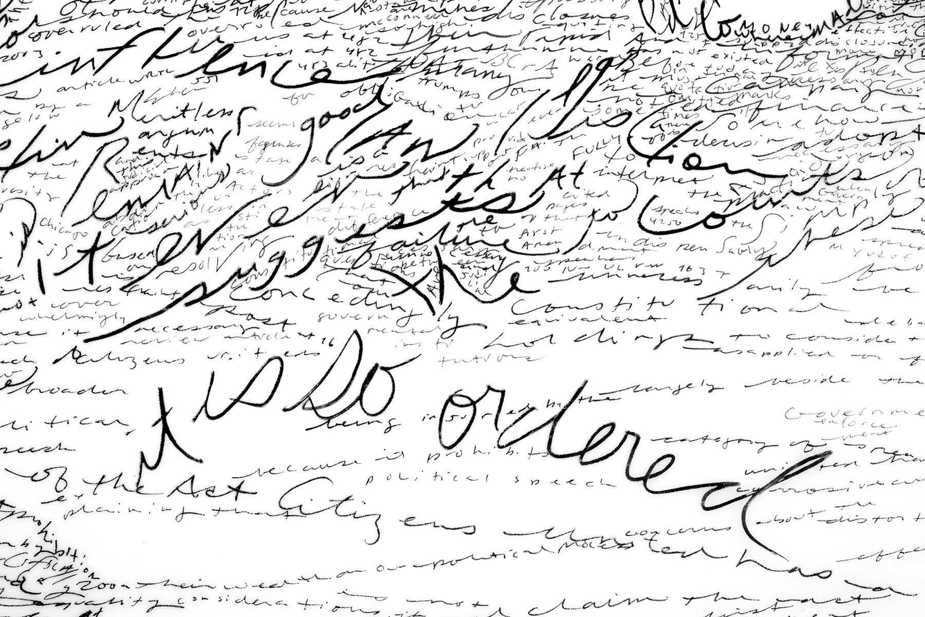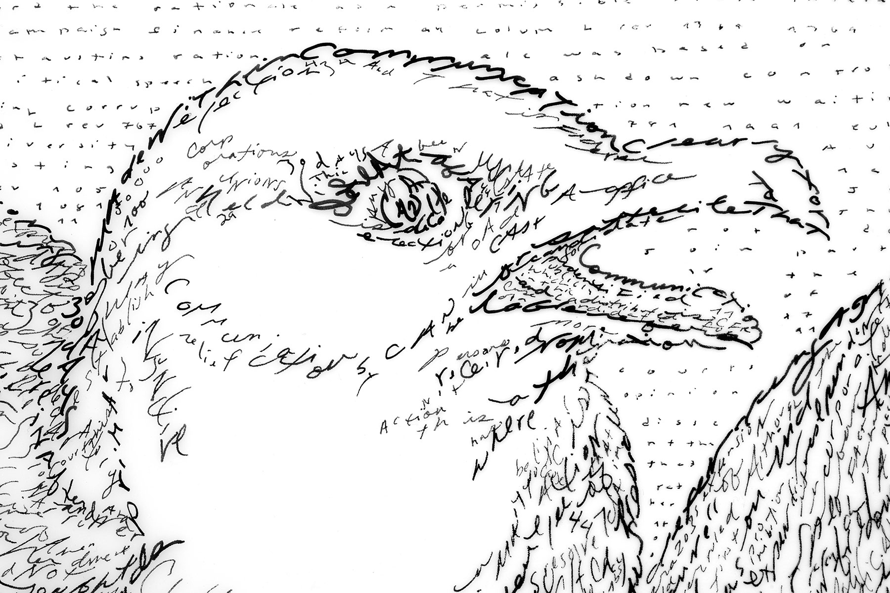 Other works in the show are even more closely tied to our current political moment. For Citizens United, Waugh copied the text of the Supreme Court’s decision of the same name – the decision that granted extra political power to monied interests, most of which aligned with Donald Trump in 2016. The image Waugh composes out of these words is of a pack of hunting dogs standing around confusedly – while a seagull and a canary seem more aware that something’s not right.