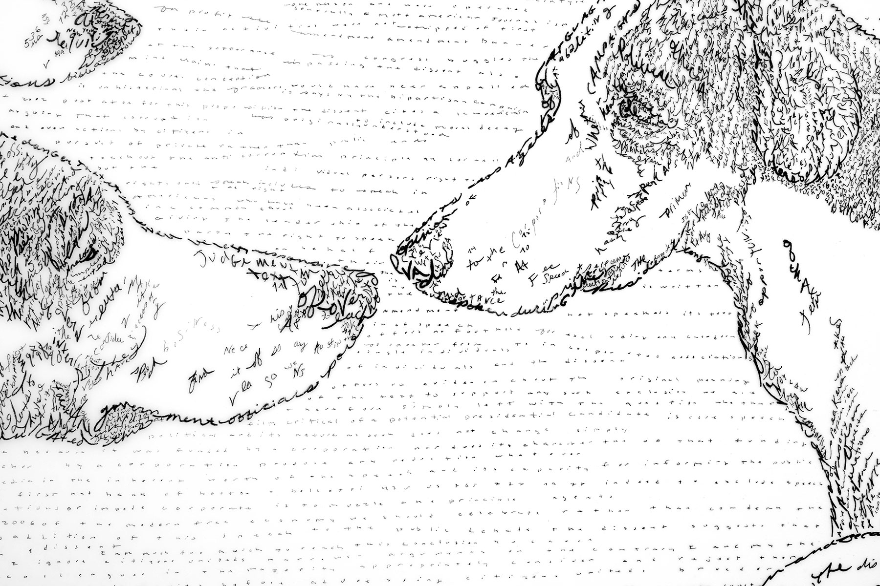 For over fifteen years, Waugh has been constructing such politically infused scenes – made all the more biting because he composes them out of text. Using the ancient calligraphic technique known as micrography, the artist laboriously copies hundreds of pages of historically significant documents, corralling that text into delicate representational forms. The destroyed bridge, for example, is composed out of words from Rachel Carson’s 1962 book Silent Spring, which ushered in the environmental movement.