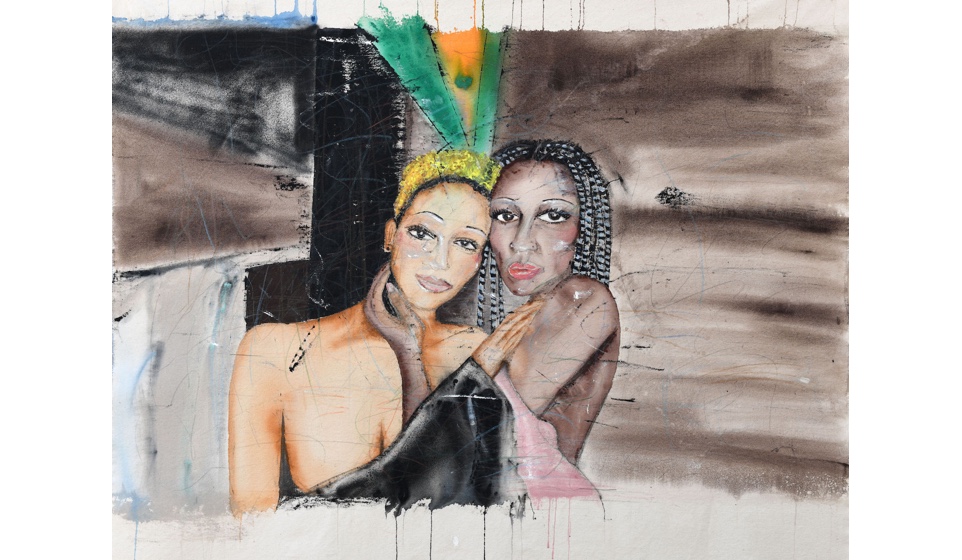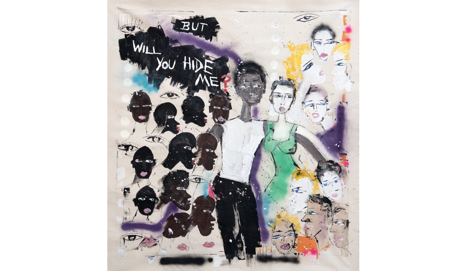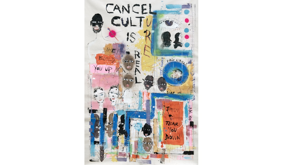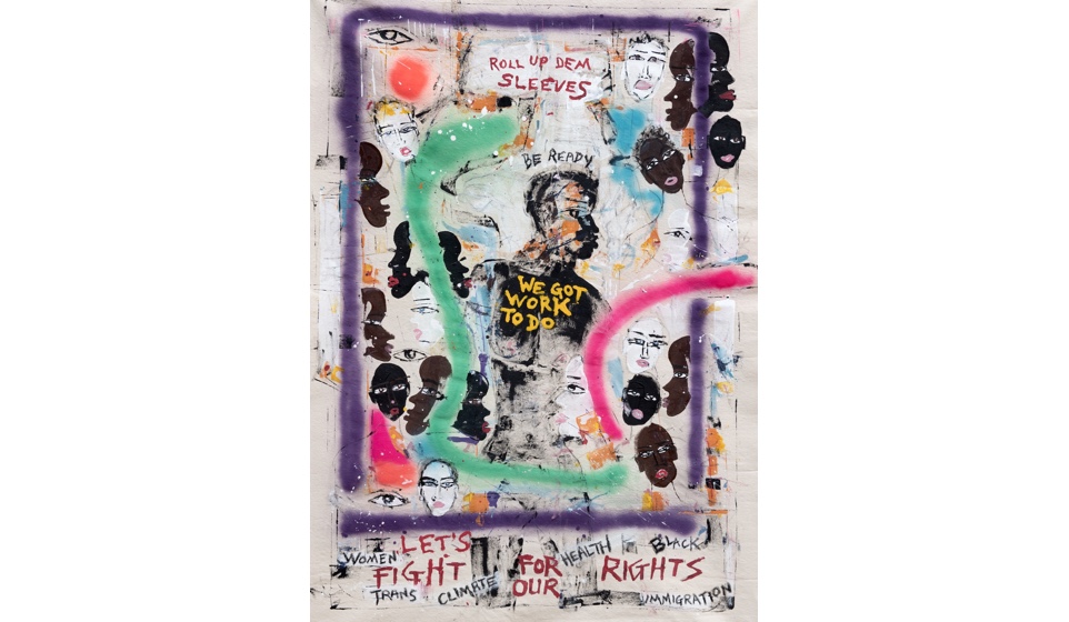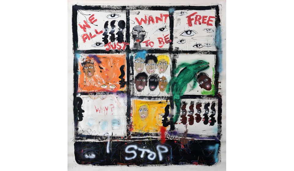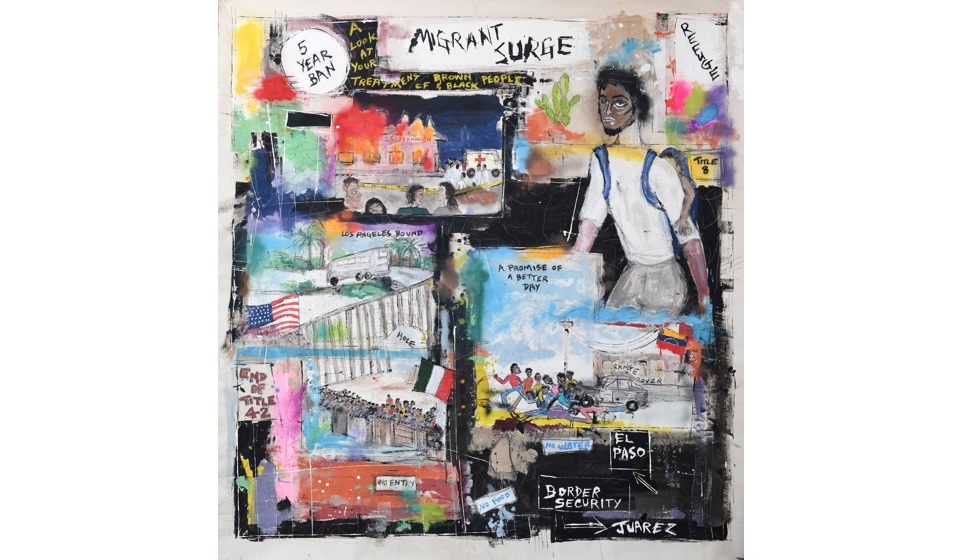 Miles Regis is known for his intricate mixed media paintings which often fuse image with text, making astute social and cultural commentary. His visual narrative is firmly based in the rich tradition and evolution of masquerades in his native Trinidad. Regis’s work is an emotional response to his life as a Black immigrant in America of 31 years. He has been painting commentary on race relations with a positive and unifying message his entire career.