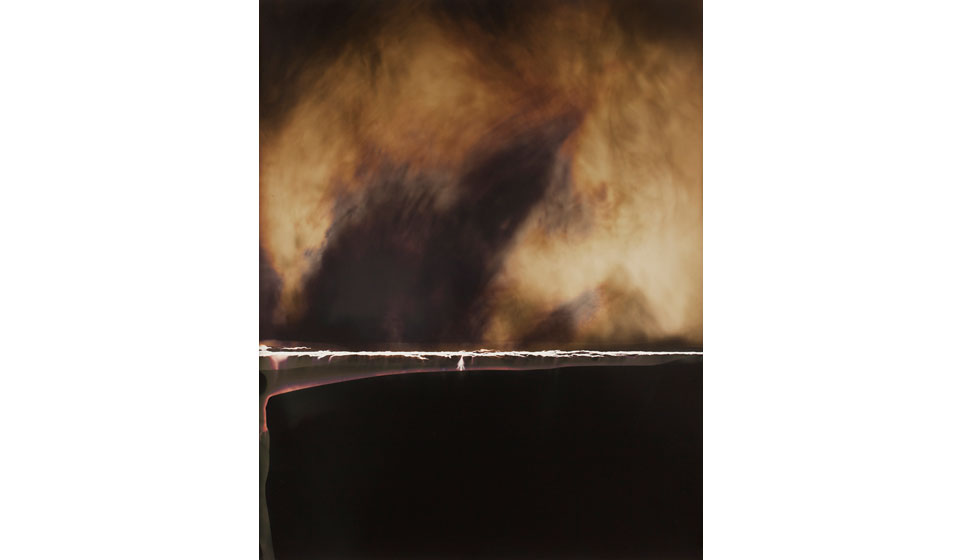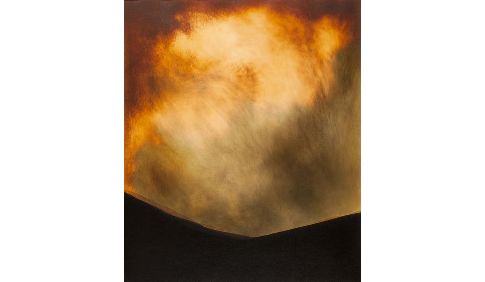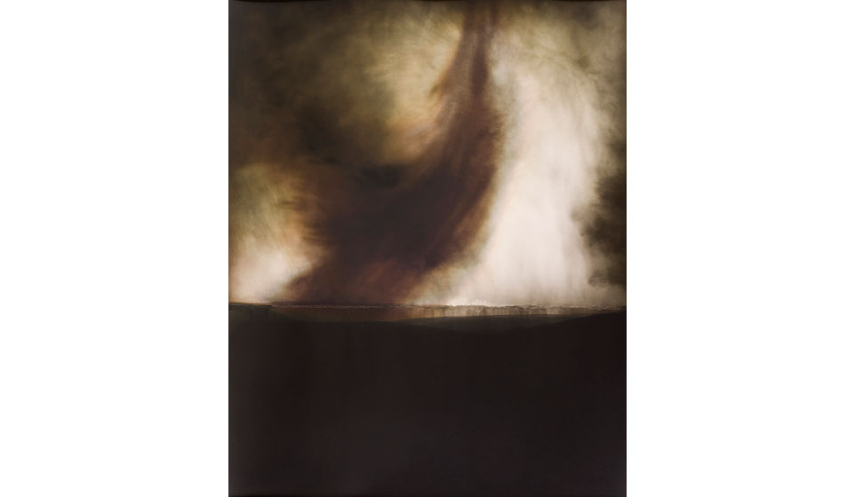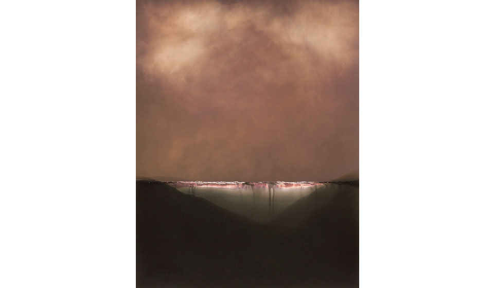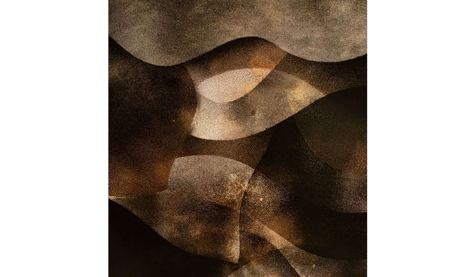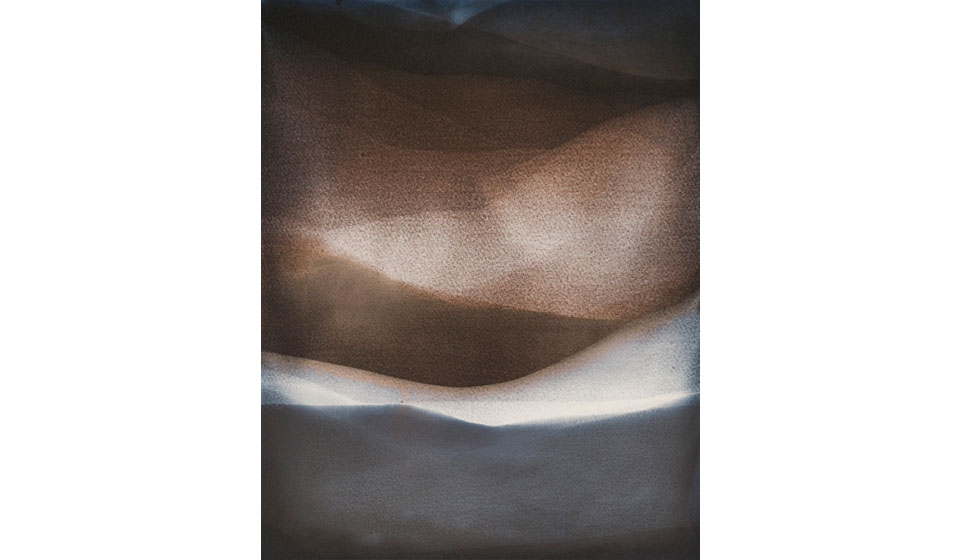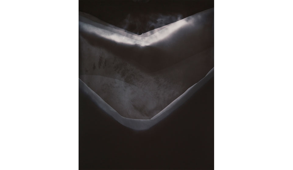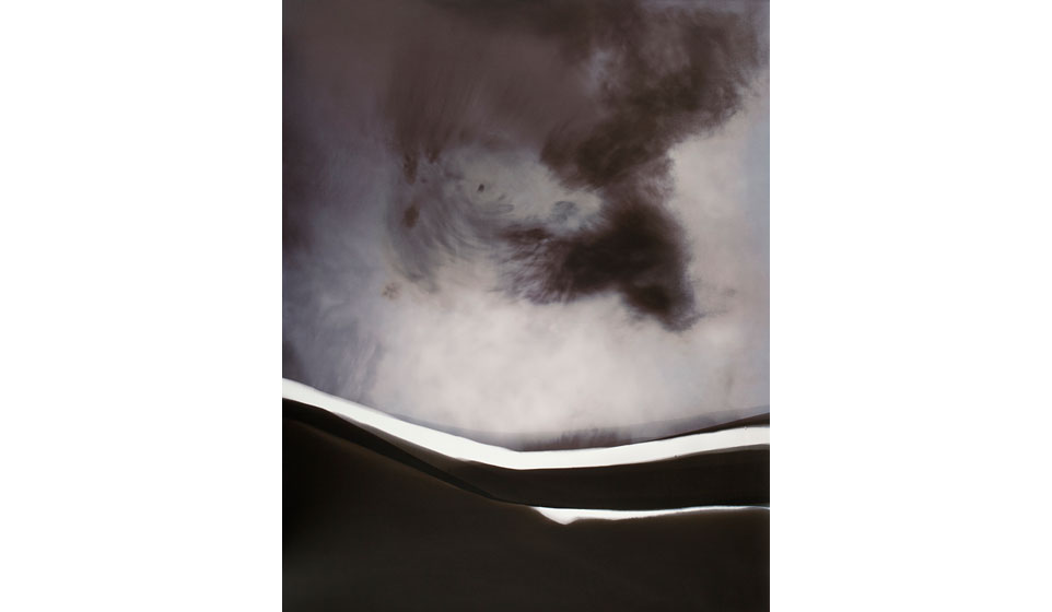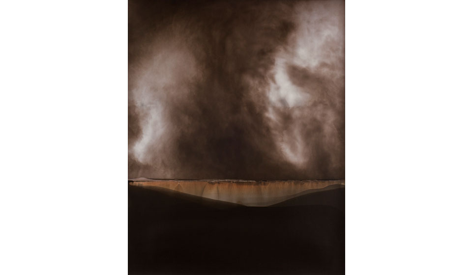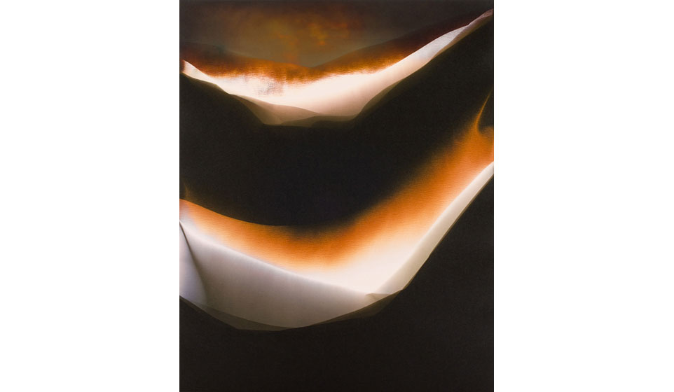 A photogram is made by exposing photosensitive paper to light; chemograms are made by exposing it to chemicals like developer and fixer. Chuck Kelton makes both chemograms and photograms, and frequently combines the techniques in single images. His velvety, stormy compositions of inky black and mottled bronze, burnt umber flares and soft, swirling shapes conjured in liquid air have a way of resembling landscapes. By folding the paper, Kelton creates a “seam” that operates as a horizon line, enhancing this effect. Meanwhile the organic and self-determined elements of the picture evoke phenomena like cloudfronts, fires, undulating waves and ridge lines -- and in the most recent work, a more primordial planetary narrative.