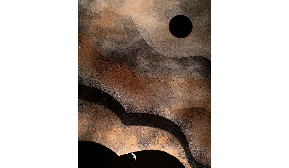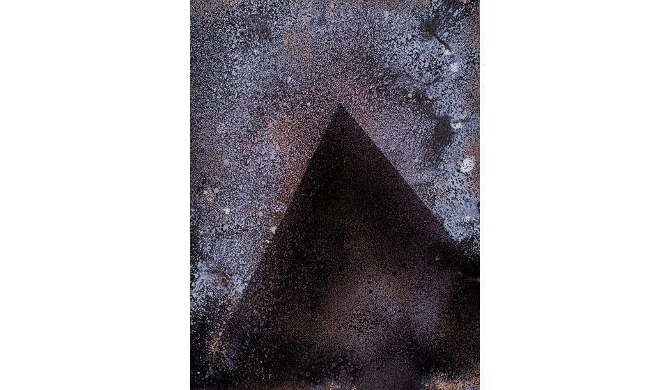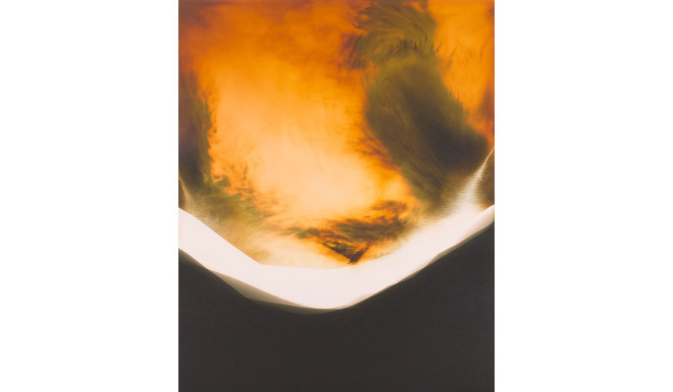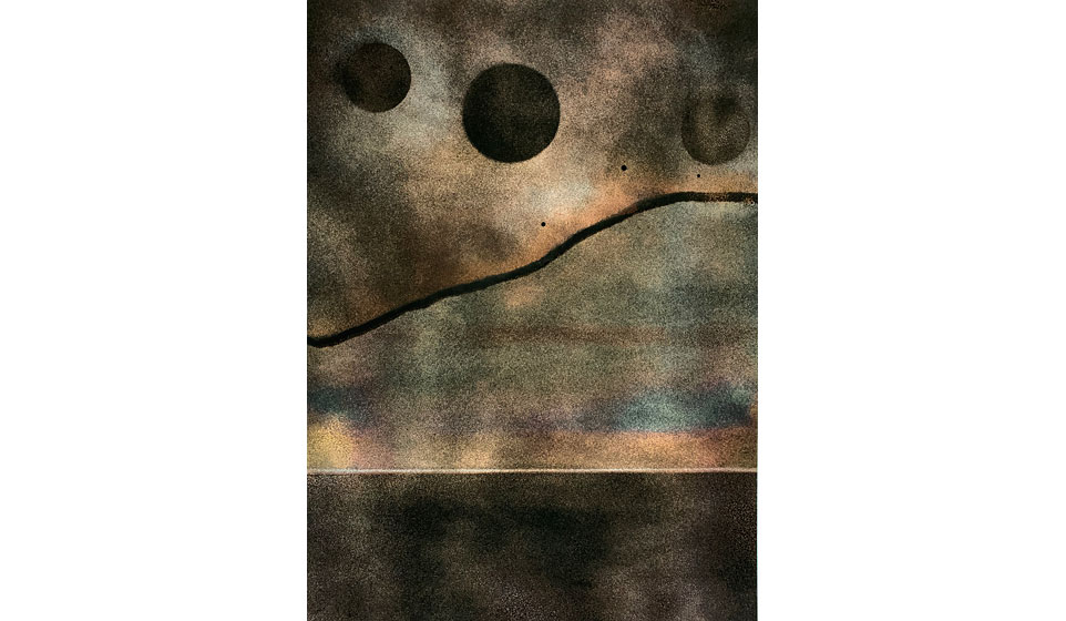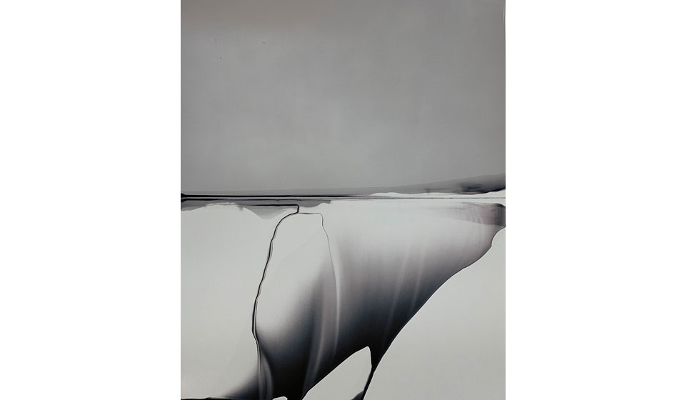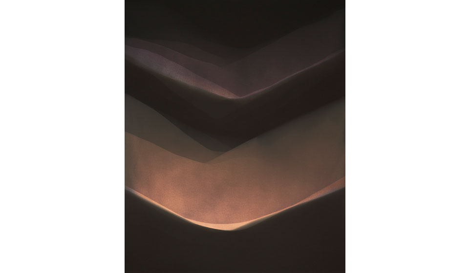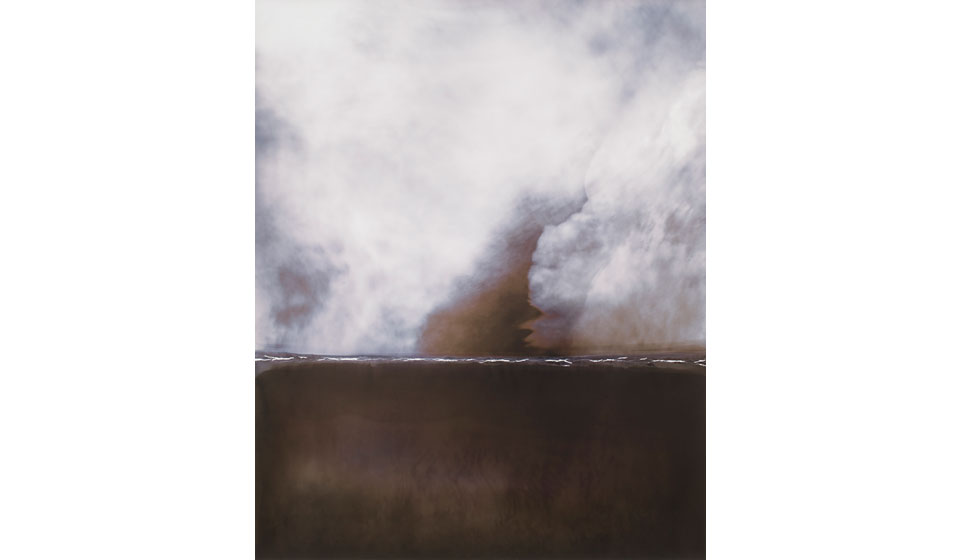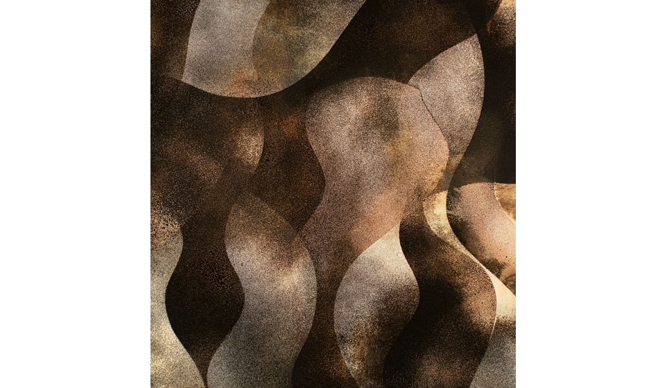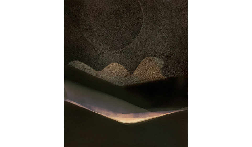 A photogram is made by exposing photosensitive paper to light; chemograms are made by exposing it to chemicals like developer and fixer. Chuck Kelton makes both chemograms and photograms, and frequently combines the techniques in single images. His velvety, stormy compositions of inky black and mottled bronze, burnt umber flares and soft, swirling shapes conjured in liquid air have a way of resembling landscapes. By folding the paper, Kelton creates a “seam” that operates as a horizon line, enhancing this effect. Meanwhile the organic and self-determined elements of the picture evoke phenomena like cloudfronts, fires, undulating waves and ridge lines -- and in the most recent work, a more primordial planetary narrative.