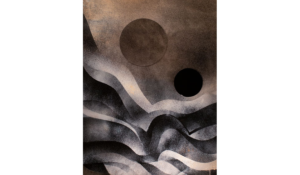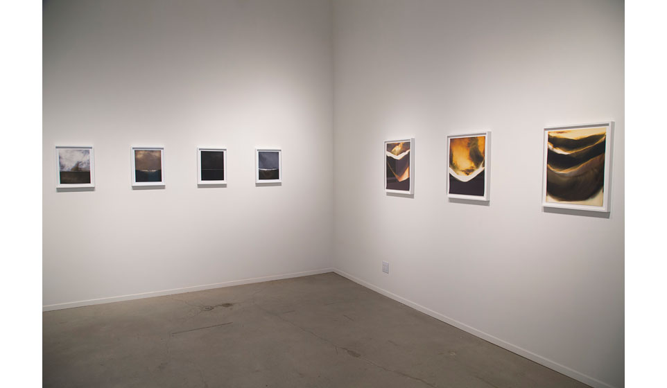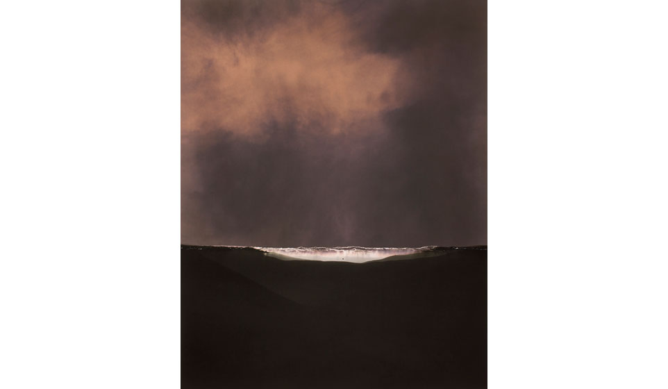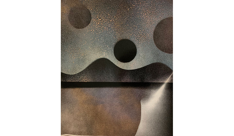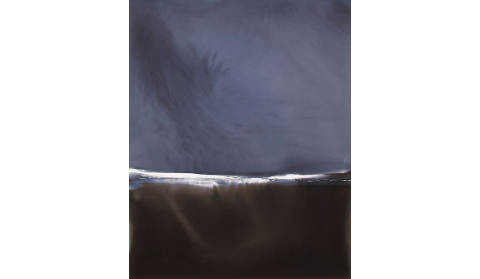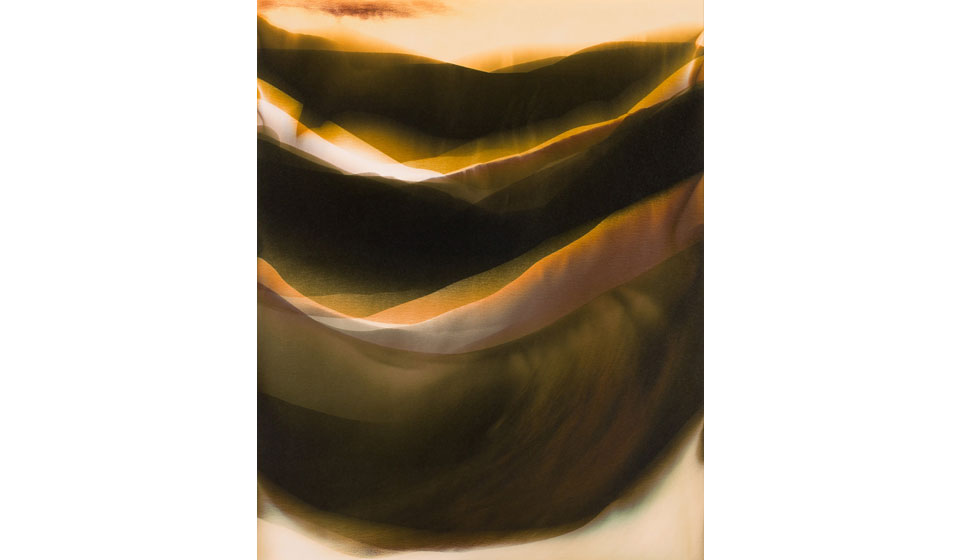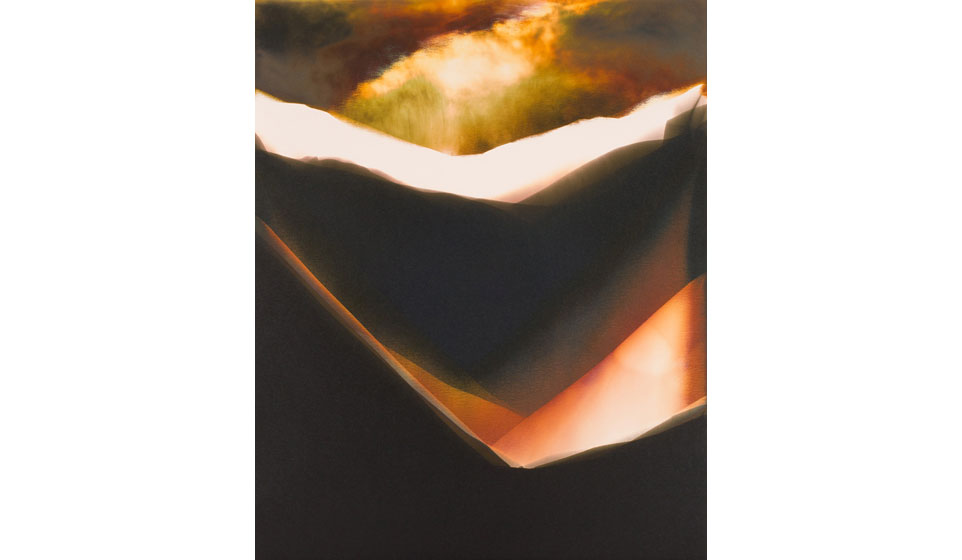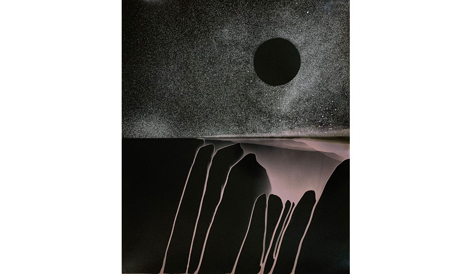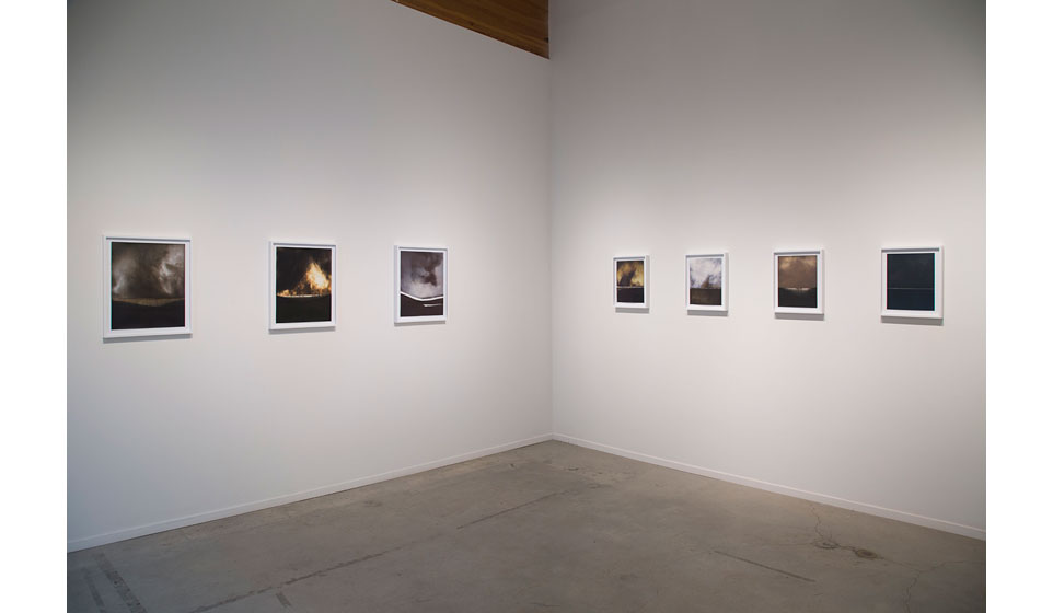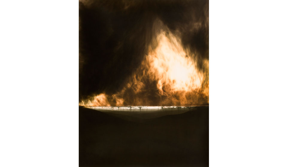 A photogram is made by exposing photosensitive paper to light; chemograms are made by exposing it to chemicals like developer and fixer. Chuck Kelton makes both chemograms and photograms, and frequently combines the techniques in single images. His velvety, stormy compositions of inky black and mottled bronze, burnt umber flares and soft, swirling shapes conjured in liquid air have a way of resembling landscapes. By folding the paper, Kelton creates a “seam” that operates as a horizon line, enhancing this effect. Meanwhile the organic and self-determined elements of the picture evoke phenomena like cloudfronts, fires, undulating waves and ridge lines -- and in the most recent work, a more primordial planetary narrative.