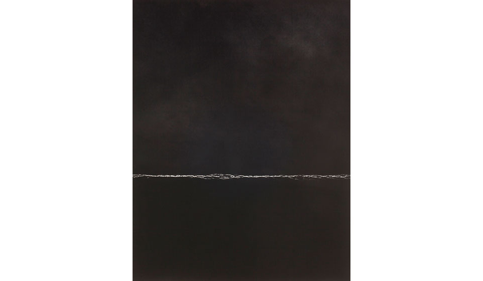 Kelton’s embrace of hand-embellished applications of gold and iron along with the oxidized silver and chemical array necessitates a process that can take months to enact, counteracting the idea of the instantly appearing photographic image and instead operating on earth time. With richly detailed textures and the appearance of linear shapes and the clean spheres of heavenly bodies, these works have the luminosity of photography with the physical and optical complexity of geological impasto. His process additive, and in his pieces he manages to not so much depict as to embody and enact the forces of landscape.